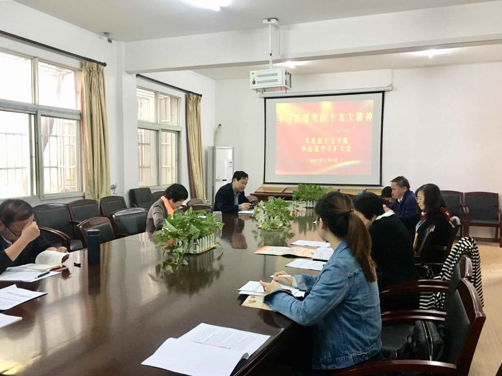 11月9日上午,马克思主义学院党委组织召开院党委理论学习中心组扩大会议,专题学习党的十九大精神。会议在学院会议室举行。院党委委员、教工党支部书记、学生党支部书记、党务干事参加了本次学习。院党委书记吴秋凤主持会议。