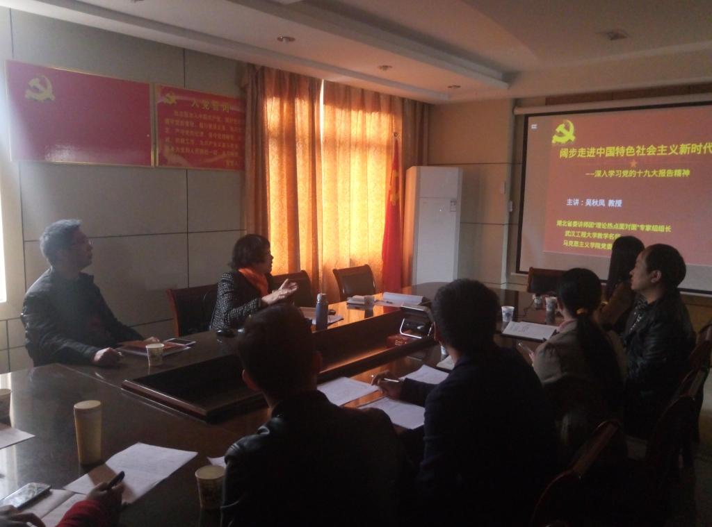 吴秋凤教授以《阔步走进中国特色社会主义新时代》为题,从“中国特色社会主义进入新时代”、“习近平新时代中国特色社会主义思想”、“新时代中国特色社会主义的战略部署”三大部分对党的十九大报告的精神进行解读,并结合实际分析了中国特色社会主义进入新时代的基本依据、主要内涵,分析了习近平新时代中国特色社会主义思想思想内涵、重大意义、基本方略,分析了新时代中国特色社会主义的战略目标、具体举措,特别是对“坚持以人民为中心”“实施乡村振兴战略”进行了深入浅出地讲解。