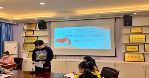 接着,第64期入党积极分子优秀学员代表秦帅同学发言。秦帅同学结合自身经历,谈到自己从一个普通学生转变成一名入党积极分子再成为一名入党发展对象的心路历程。以及认识到成为一名合格的党员不仅要在思想上入党,更要落实到实际行动中。为此,秦帅同学总结了三点内容:第一是要端正自己的入党动机,认真学习宣传党的路线方针政策。第二是要以党员的标准来严格要求自己,努力向党员同志看齐。第三是在培训过程中,要认真学习、勤于思考,努力掌握更多的知识和理论。最后,秦帅同学通过自己的经历向新学员表达寄予:“希望通过本次学习,大家都能有所收获,为中华之崛起,为民族之复兴,尽我们的责任和义务,做一名思想政治素养高,文化知识优秀的新时代研究生。”
