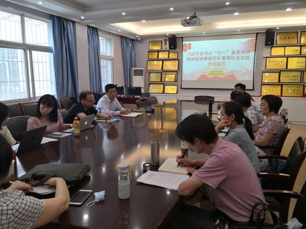 (通讯员 蔡明广 朱亚美)7月12日下午两点,马克思主义学院在学院会议室开展学习习近平总书记“七一”重要讲话精神宣讲暨研究生暑期社会实践出征仪式。参加活动的有院长曹胜亮、副院长常城以及十余名即将赴鄂州参与省委讲师团宣讲的博士教授、“博闻求是”研究生政治理论宣讲团实践队成员。本次活动由学院团委书记蔡明广主持。