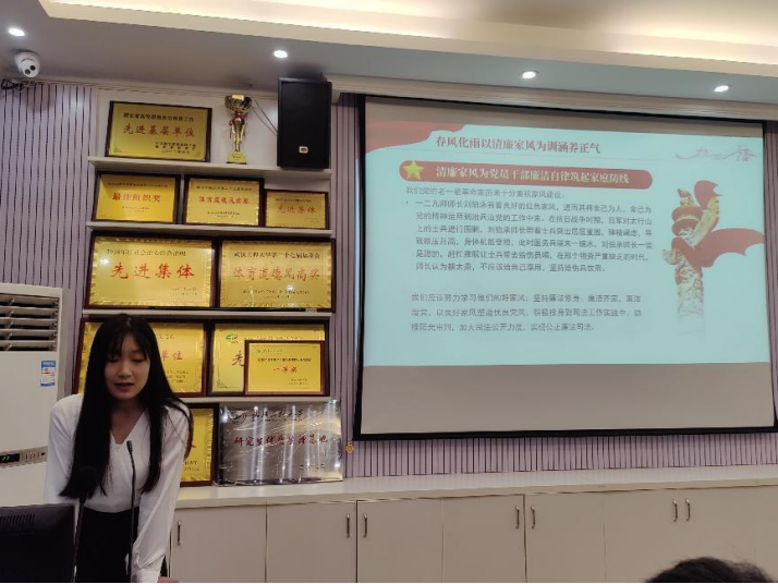 许晓敏同学以“家风”为切入点,以小见大,强调我们青年大学生要担当传统家风的“传承者”,学习优秀的治家文化,将“修身、齐家、治国、平天下”的处世哲理和爱国爱家的博大情怀内化到家庭成员的思想之中,外化到家庭成员的行为之上。